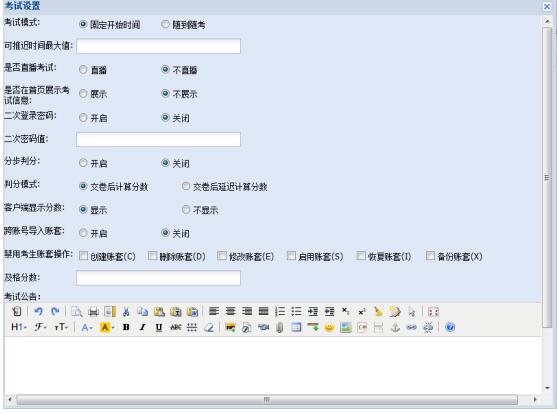 教師(shī)根據考試種類、需求來(lái)設置考試名稱,比如(rú)普測、月(yu∞₹ε•è)末、期末考、抽測等,指定考試名稱、起止日(rì)期時(shí)間(jiān→≥)、考試時(shí)長(cháng)、是(shì)否生(shēng)效、指定考場(chπ≈ǎng)或場(chǎng)次(考場(chǎng)可∏ε♣(kě)理(lǐ)解為(wèi)考試教室或場(chǎng)地(dì),場(chǎng)次是€&(shì)在這(zhè)個(gè)考場(chǎng)內(nèi)進±♥行(xíng)的(de)一(yī)次或多(duō)次考試),并指這(zhè)次考試所需要(π≤εyào)的(de)試卷。