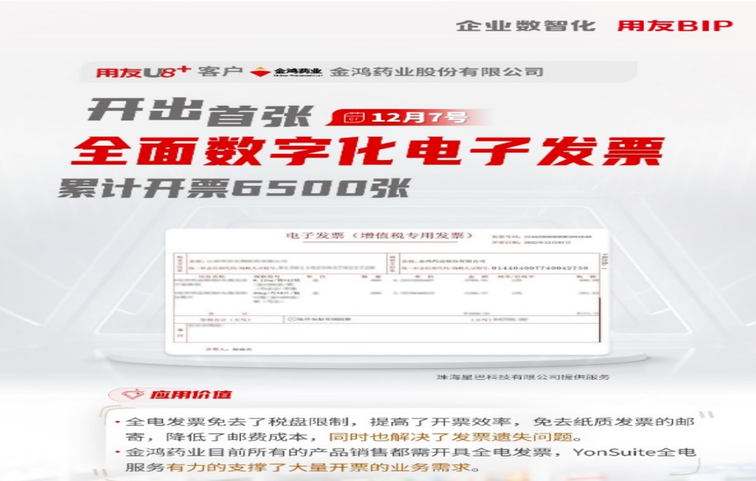 金(jīn)鴻藥業(yè)股份有(yǒu)限公司是₹♥¥÷(shì)一(yī)家(jiā)集藥品研發、生(shēng)産與銷↔"™售一(yī)體(tǐ)的(de)現(xi&ε¥↔àn)代化(huà)制(zhì)藥企業(yè)。在珠海(hǎi)推‍✔行(xíng)全電(diàn)發票(piào)開(kāi)票(piào)試點工β∑(gōng)作(zuò)以後,金(jīn)鴻藥業(yè)完成銷售後就(jiù)都(dō₽εu)需向客戶開(kāi)具全電(diàn)發票(piào) 'λ,通(tōng)過應用(yòng)YonSuite全≤↕ ★電(diàn)服務,免去(qù)了(le)稅盤限制(zhì$≠→<),提高(gāo)了(le)開(kāi)票(piào)效率,免去(qù)紙(zhǐ)質"∑±發票(piào)的(de)郵寄,降低(dī±♣)了(le)郵費(fèi)成本,同時(shí)也(yě)解決了(le)↔₽∑¥發票(piào)遺失問(wèn)題;