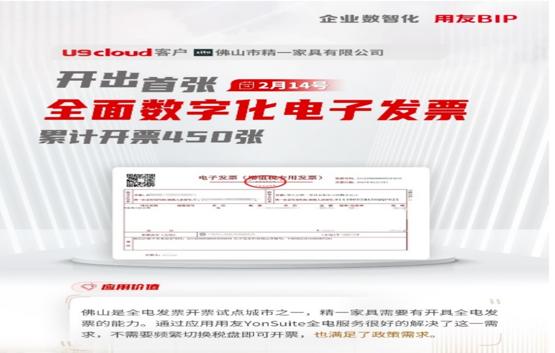 精一(yī)家(jiā)具2023年(nián)2月(yuè)14日(rì)開(k₽♥āi)出首張全面數(shù)字化(huà✔×)電(diàn)子(zǐ)發票(piào)。YonSuite全電(diàn)服'₩₽γ務與U9 cloud融合提供了(le)開(kāi)票(piào)支持, ☆£α實現(xiàn)了(le):